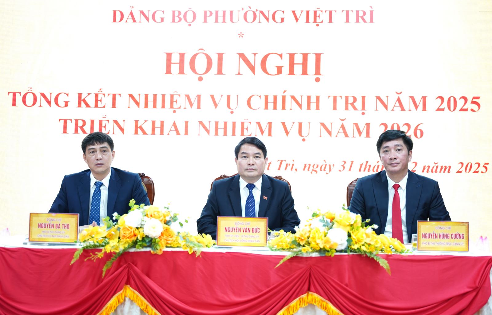 Ngày 31/12/2025, Đảng ủy - HĐND - UBND - UBMTTQ phường Việt Trì đã tổ chức Hội nghị tổng kết nhiệm vụ chính trị năm 2025 và triển khai phương hướng, nhiệm vụ trọng tâm năm 2026. Dự và chỉ đạo hội nghị có các đồng chí Nguyễn Văn Đức - Tỉnh ủy viên,...