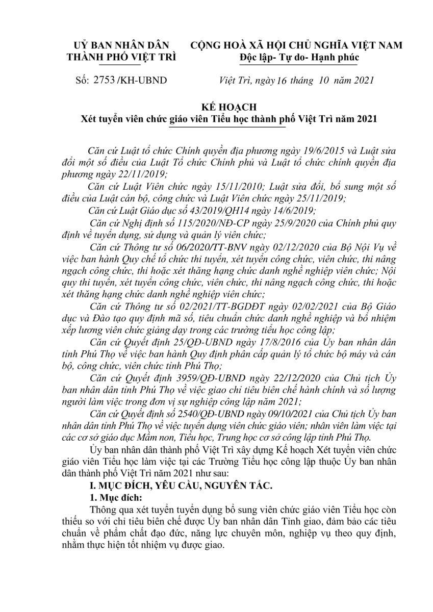 Kế hoạch xét tuyển viên chức giáo viên Tiểu học thành phố Việt Trì năm 2021