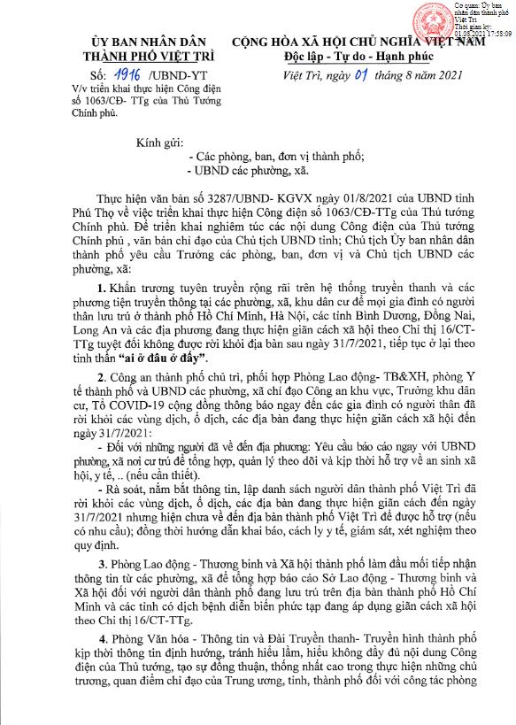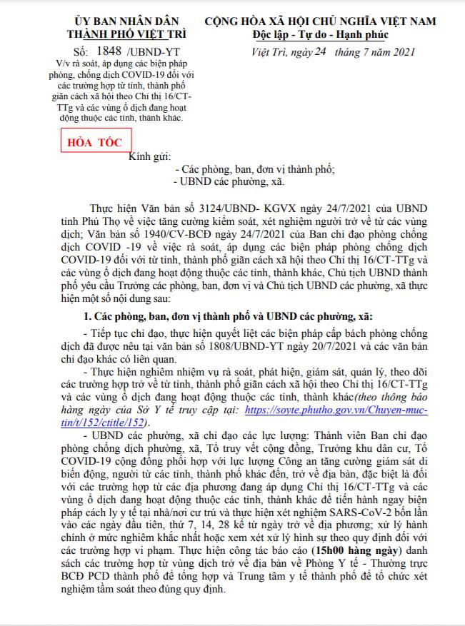 Thông báo về việc rà soát, áp dụng các biện pháp phòng, chống dịch Covid-19 đối với các trường hợp từ tỉnh, thành phố giãn cách xã hội theo chỉ thị 16/CT-TTg và các vùng ổ dịch đang hoạt động thuộc các tỉnh, thành khác