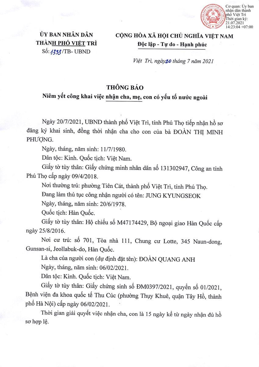 THÔNG BÁO Niêm yết công khai việc nhận cha, mẹ, con có yếu tố nước ngoài (Đoàn Thị Minh Phượng)