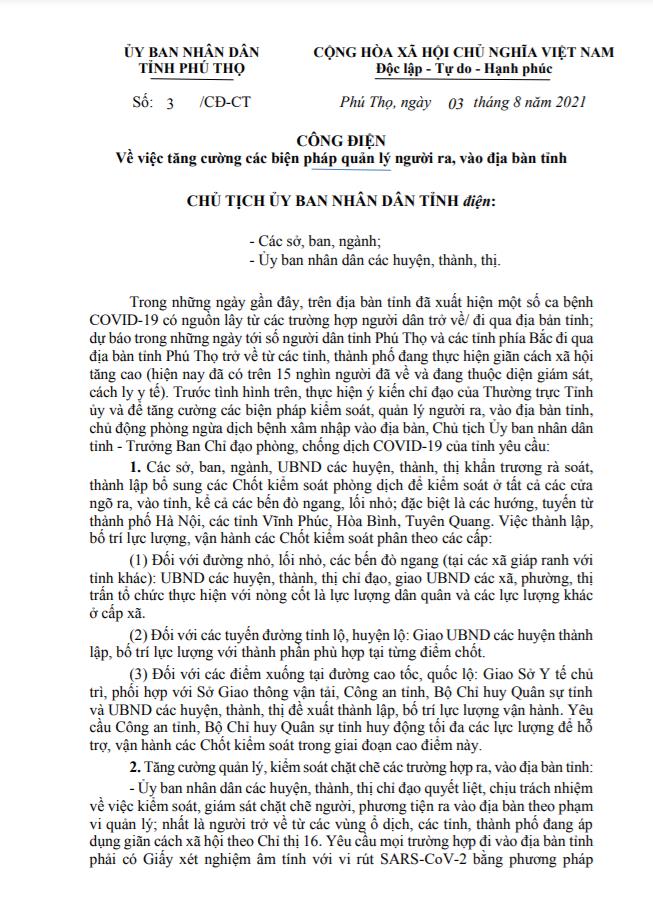 Công điện về việc tăng cường các biện pháp quản lý người ra, vào địa bàn tỉnh
