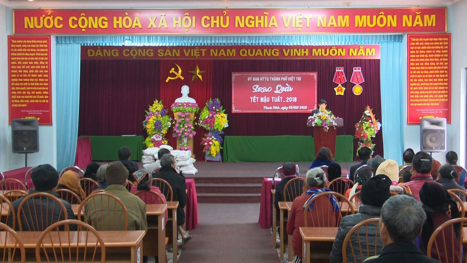 Nhằm chia sẻ với các gia đình nghèo có thêm điều kiện vui xuân đón Tết, sáng ngày 2/2/2018, UBMT Tổ quốc thành phố Việt Trì phối hợp với Công ty TNHH Thành An đã đi thăm, tặng quà cho các gia đình nghèo của 2 xã: Thanh Đình, Phượng Lâu và 2 phường...
