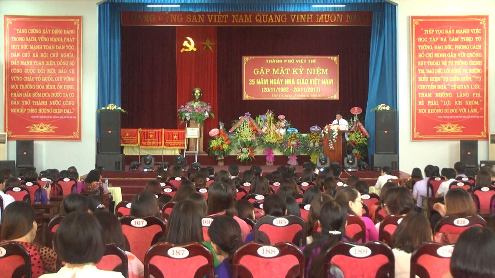 Chiều 17/11, UBND thành phố Việt Trì đã tổ chức Gặp mặt kỷ niệm 35 năm ngày Nhà giáo Việt Nam (20/11/1982 – 20/11/2017). Dự buổi lễ có các đồng chí: Nguyễn Huy Hoàng – UV BTV Tỉnh ủy, Bí thư Thành ủy, Chủ tịch HĐND thành phố; Lê Hồng Vân – Tỉnh ủy viên, Chủ tịch UBND thành phố; các đồng chí trong Ban thường vụ Thành ủy; trưởng các phòng, ban, ngành, đoàn thể của thành phố; hiệu trưởng các trường mầm non, tiểu học, THCS trên địa bàn.