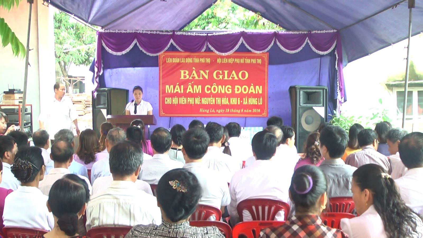Sáng 19/8, Liên đoàn Lao động tỉnh và Hội Liên hiệp phụ nữ tỉnh đã tổ chức bàn giao công trình “mái ấm công đoàn” cho hội viên Nguyễn Thị Hòa, khu 6, xã Hùng Lô. Tới dự có đại diện lãnh đạo LĐLĐ tỉnh, thành phố, Hội phụ nữ tỉnh, thành phố, lãnh đạo...