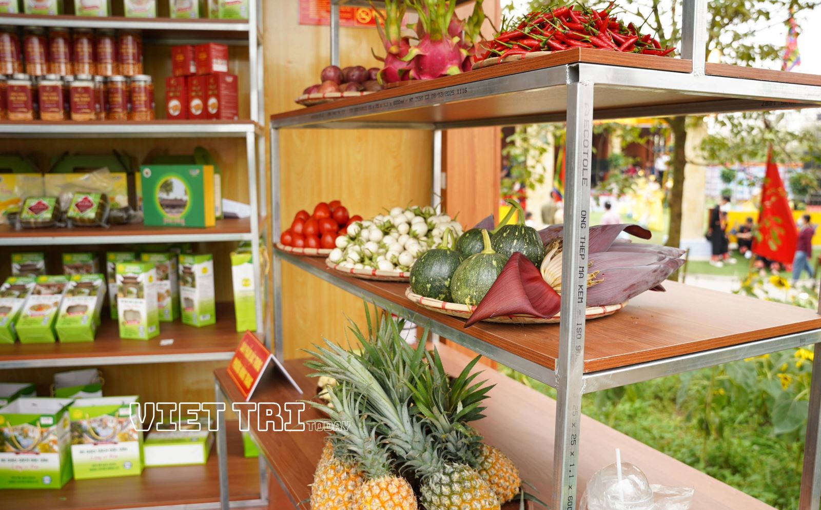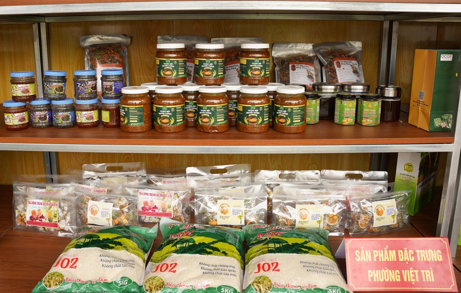 Gian hàng được bày trí khoa học, đẹp mắt, với không gian mở, thuận tiện cho việc tham quan và trải nghiệm của người dân và du khách. Các sản phẩm được sắp xếp theo từng nhóm, sản phẩm rõ ràng về nhãn mác, nguồn gốc cũng như giá trị đặc trưng của từng sản phẩm Ocop, giúp người xem dễ dàng tìm hiểu và lựa chọn.