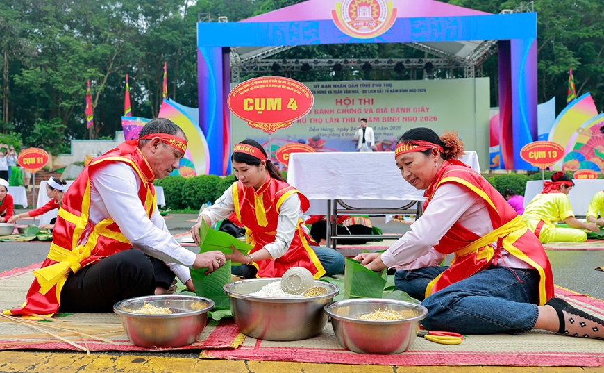 Hội thi quy tụ 18 đội với 180 nghệ nhân đến từ các cụm xã, phường trên địa bàn tỉnh Phú Thọ. Các đội tranh tài ở 2 nội dung: Gói, nấu bánh chưng và giã bánh giầy, tái hiện sinh động phong tục làm lễ vật dâng cúng tổ tiên có từ thời các Vua Hùng.