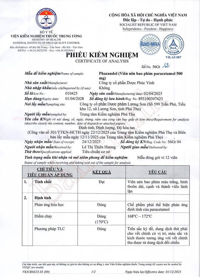 Để kịp thời ngăn chặn việc lưu hành tiêu thụ sản phẩm trên ra thị trường, UBND phường Việt Trì yêu cầu các đơn vị của UBND phường thông báo tới các cơ sở khám, chữa bệnh, các cơ sở kinh doanh dược tiến hành thu hồi toàn bộ lô thuốc Viên nén bao phim Phazandol (Paracetamol 500mg), số đăng ký: 893100307423, số lô sản xuất: 010425, ngày sản xuất: 020425, hạn dùng: 010428, do Công ty Cổ phần Dược Phúc Vinh sản xuất tại các cơ sở kinh doanh, sử dụng thuốc trên địa bàn.