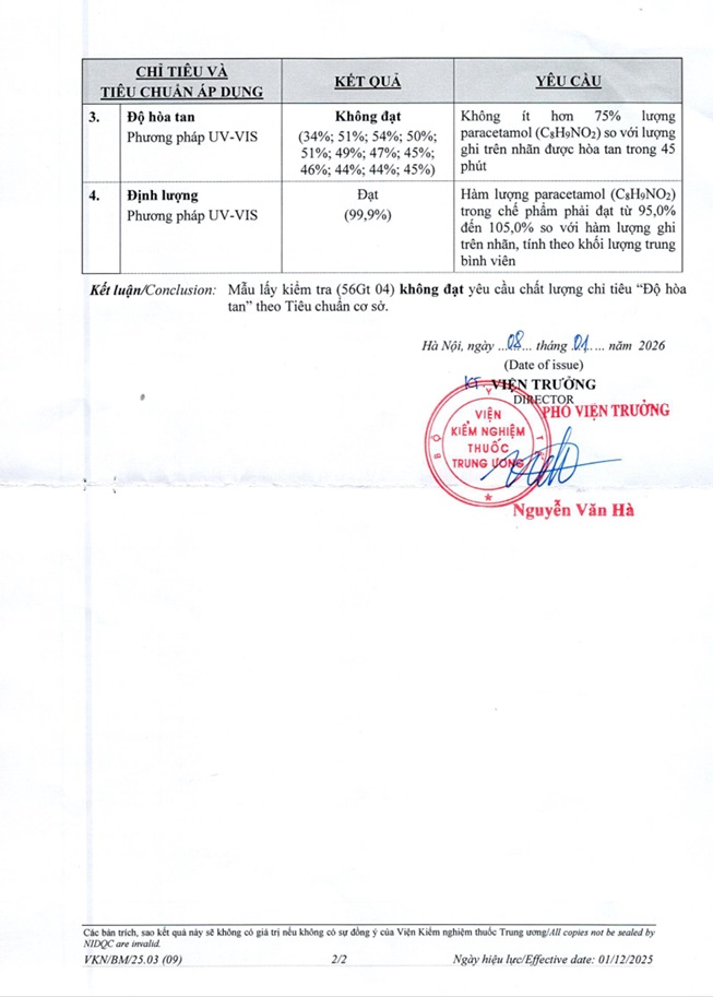Do thiết bị thử độ hoà tan chưa được hiệu chuẩn và cơ sở Hòa Bình chưa đáp ứng quy định tại Điều 122 Nghị định 163/2025/NĐ-CP nên Trung tâm đã gửi mẫu về Viện kiểm nghiệm thuốc Trung ương để kiểm tra chất lượng. Kết quả kiểm nghiệm của Viện kiểm nghiệm thuốc Trung ương cho thấy: mẫu thuốc Viên nén bao phim Phazandol (Paracetamol 500mg) nêu trên không đạt tiêu chuẩn chất lượng về “Độ hoà tan” theo Tiêu chuẩn cơ sở số 01 TPTD.