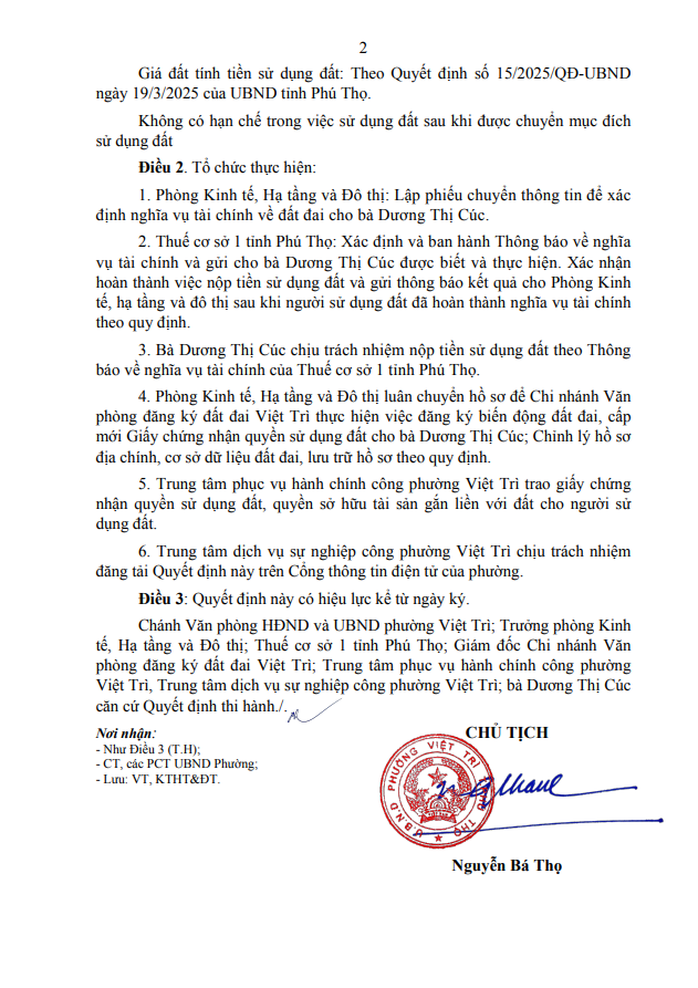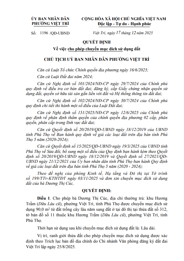 Quyết định về việc cho phép chuyển mục đích sử dụng đất hộ bà Dương Thị Cúc