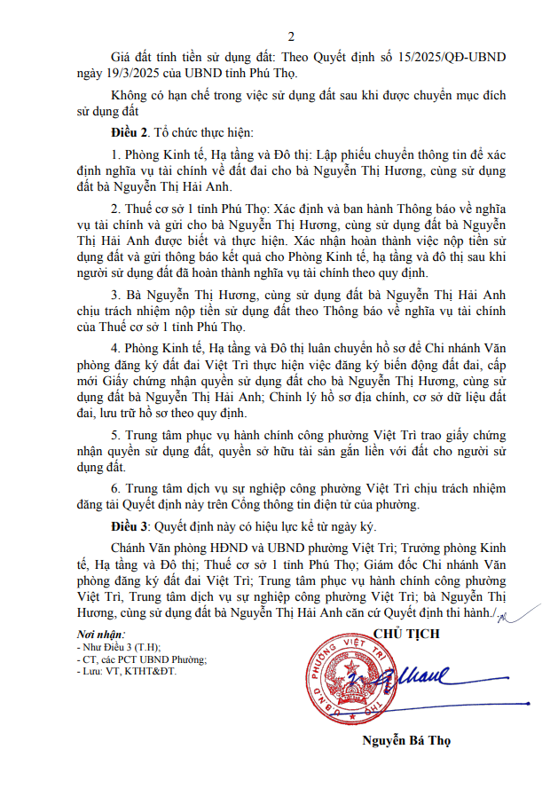 Quyết định về việc cho phép chuyển mục đích sử dụng đất hộ bà Vũ Thị Lý
