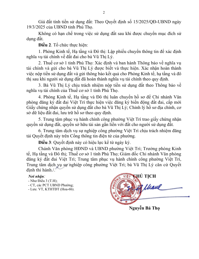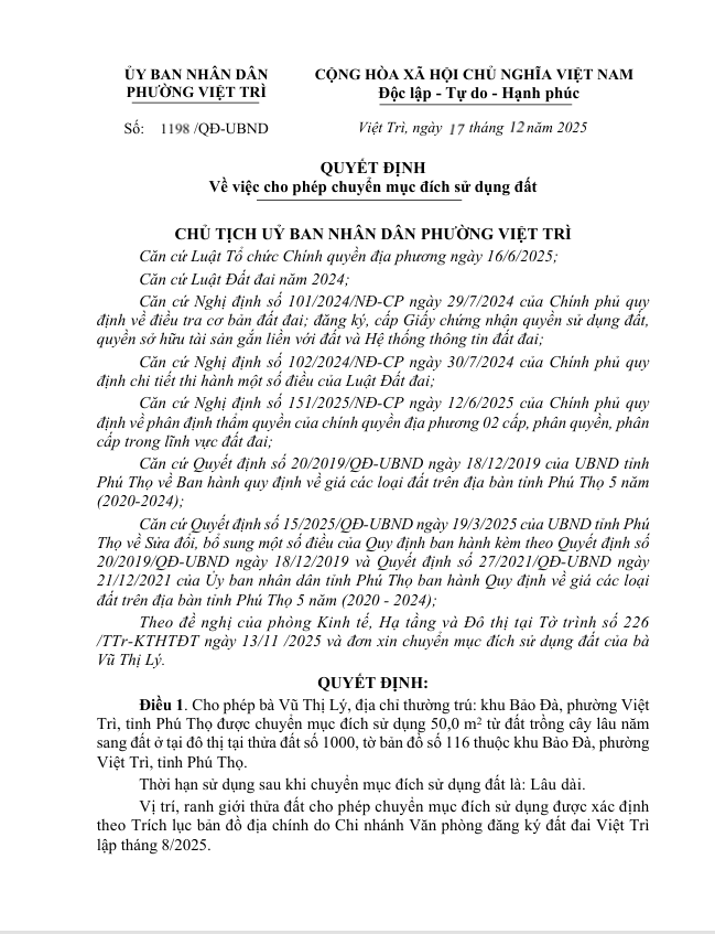 Quyết định về việc cho phép chuyển mục đích sử dụng đất hộ bà Vũ Thị Lý