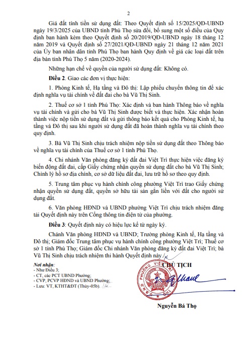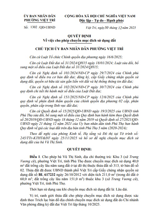 Quyết định về việc cho phép chuyển mục đích sử dụng đất hộ bà Vũ Thị Sinh