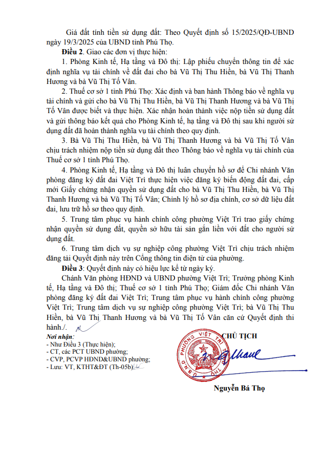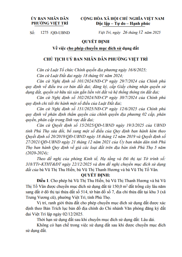 Quyết định về việc cho phép chuyển mục đích sử dụng đất hộ bà Vũ Thị Thu Hiền, bà Vũ Thị Thanh Hương và bà Vũ Thị Tố Vân