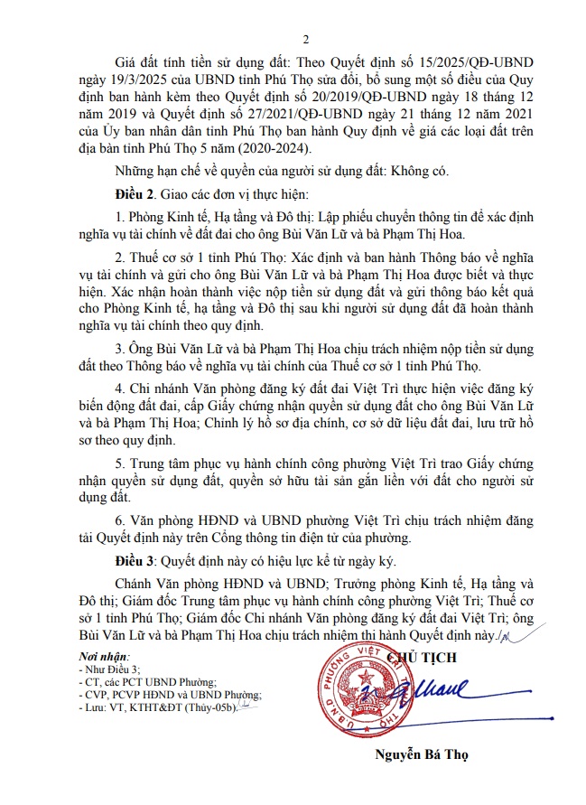 Quyết định về việc cho phép chuyển mục đích sử dụng đất hộ ông Bùi Văn Lữ và bà Phạm Thị Hoa