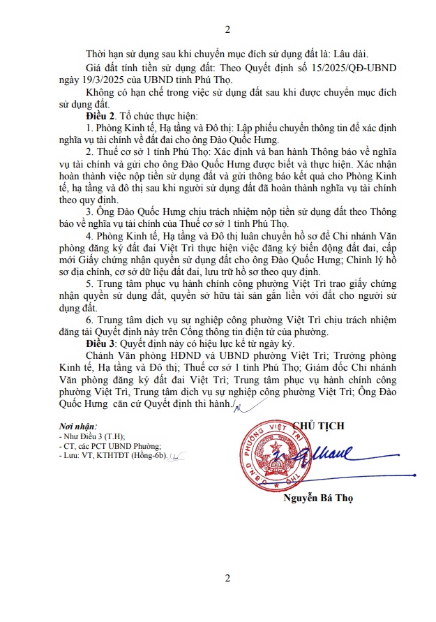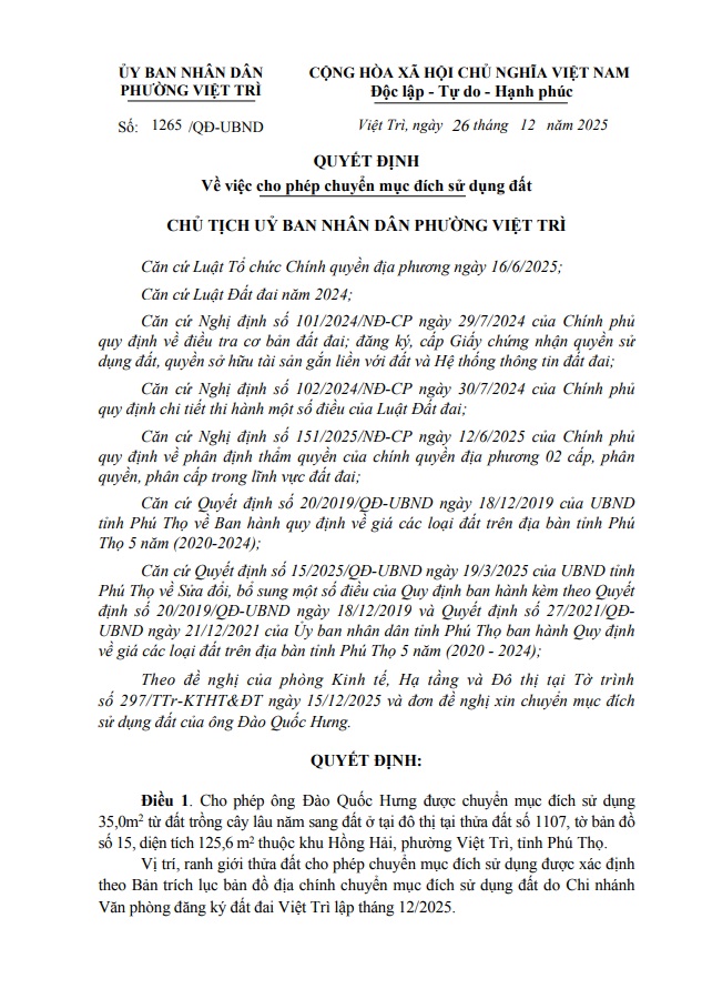 Quyết định về việc cho phép chuyển mục đích sử dụng đất hộ ông Đào Quốc Hưng