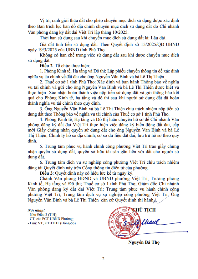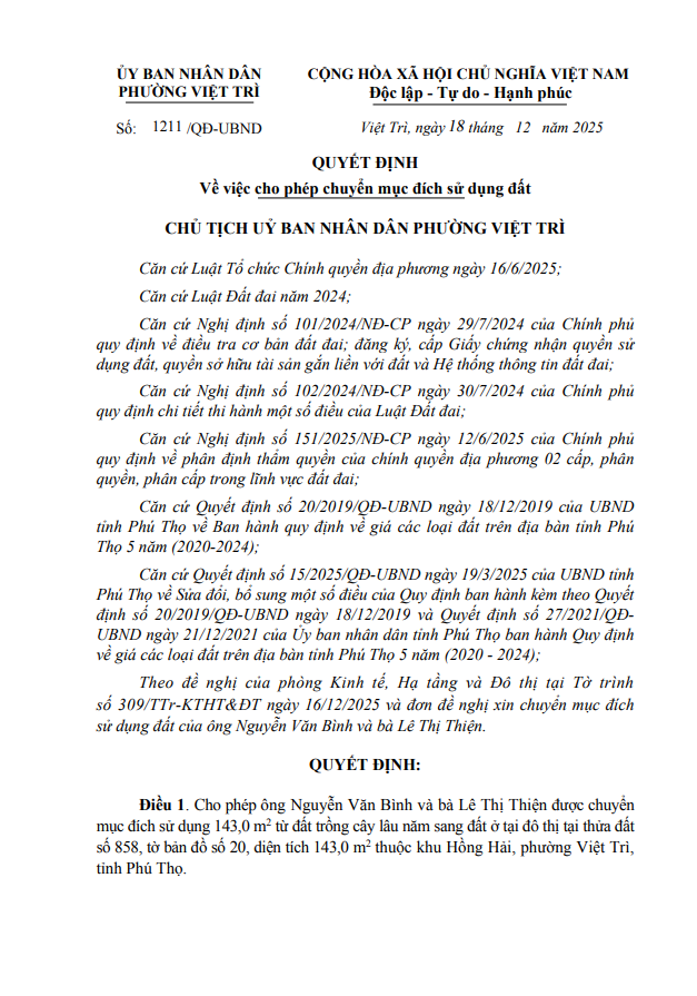 Quyết định về việc cho phép chuyển mục đích sử dụng đất hộ ông Nguyễn Văn Bình và bà Lê Thị Thiện