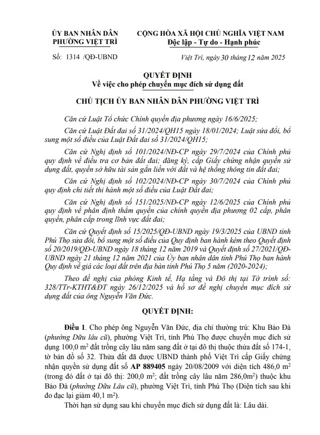 Quyết định về việc cho phép chuyển mục đích sử dụng đất hộ ông Nguyễn Văn Việt và bà Hoàng Thị Huyên