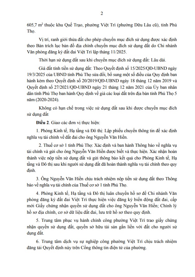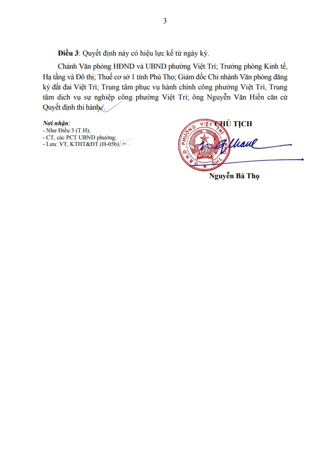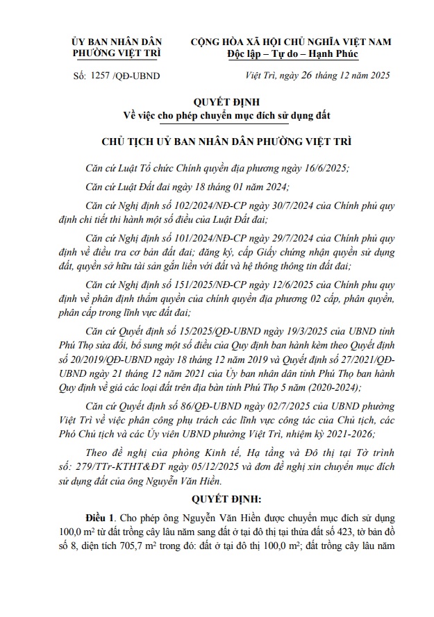 Quyết định về việc cho phép chuyển mục đích sử dụng đất hộ ông Nguyễn Văn Hiền