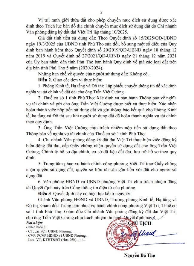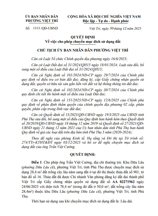 Quyết định về việc cho phép chuyển mục đích sử dụng đất hộ ông Trần Việt Cường